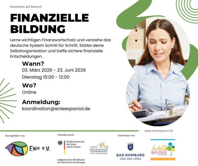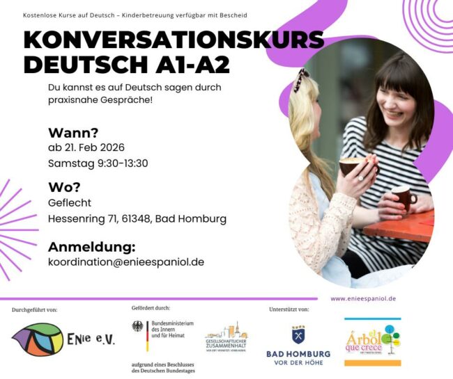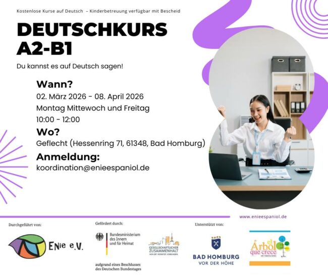 Du kannst es auf Deutsch sagen! Wann? 02. März 2026 – 08. April 2026 Montag Mittewoch und Freitag 10:00 – 12:00 Wo? Geflecht (Hessenring 71, 61348, Bad Homburg) Anmeldung: